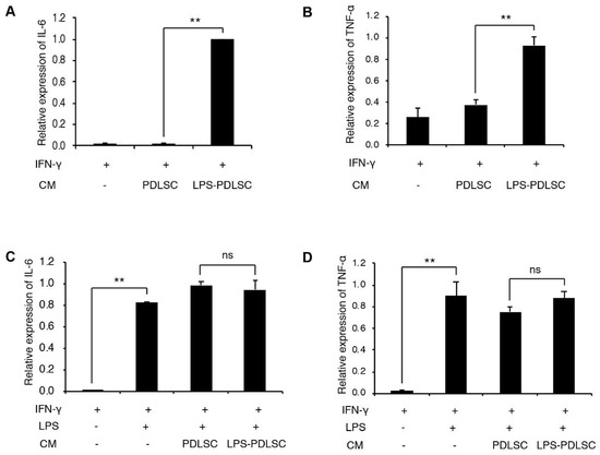Effect of PDLSCs or LPS-preconditioned PDLSCs on the polarization of THP-1 cells with M1 stimulating agents. The conditioned media from PDLSCs or LPS-preconditioned PDLSCs were added to M0 THP-1 cells with interferon (IFN)-γ (A,B) or IFN-γ/LPS (C,D). Relative mRNA expression of IL-6 (A,C) and TNF-α (B,D) were analyzed by RT-qPCR. CM: Conditioned medium, IFN-γ: 20 ng/mL of IFN-γ, LPS: 1 μg/mL of LPS, PDLSC and LPS-PDLSC: the conditioned media from PDLSCs and LPS-preconditioned PDLSCs, respectively. Data shown as the mean ± SD, n = 3, ns: Not significant, ** p < 0.01.