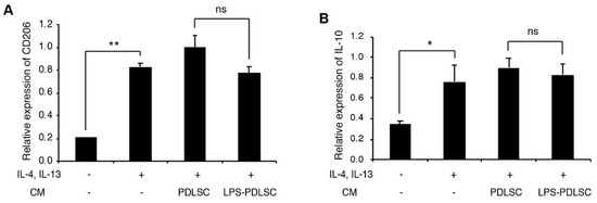 Effect of PDLSCs or LPS-preconditioned PDLSCs on the polarization of THP-1 cells with M2 stimulating agents. The conditioned media from PDLSCs or LPS-preconditioned PDLSCs were added to M0 THP-1 cells with 20 ng/mL of IL-4 and IL-13. Relative mRNA expression of CD206 (A) and IL-10 (B) were analyzed by RT-qPCR. CM: the conditioned medium from PDLSC and LPS-PDLSC: The conditioned media from LPS-preconditioned PDLSCs. Data shown as the mean ± SD, n = 3, ns: Not significant, * p < 0.05, ** p < 0.01.