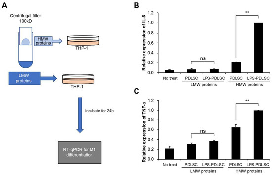 Separation of fractions from the conditioned media of PDLSCs using centrifugal filter device and their effects on the M1 polarization of THP-1 cells. The conditioned media from PDLSCs or LPS-preconditioned PDLSCs were separated using the centrifugal filter device, Amicon ultra-2 100 kDa (Millipore), into high-molecular weight (HMW) proteins and low-molecular weight (LMW) proteins. They were applied to M0 THP-1 cell with IFN-γ and the mRNAs expression for M1 polarization were analyzed. (A) Schematic summary of the experimental process. (B,C) mRNAs expression of THP-1 cells treated with isolated HMW or LMW proteins. Relative mRNA expression of IL-6 (B) and TNF-α were analyzed by RT-qPCR. Data shown as the mean ± SD, n = 3, ns: Not significant, ** p < 0.01.