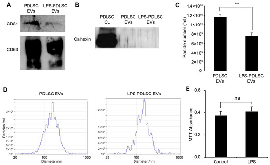 Isolation of EVs from PDLSCs and their characterization. EVs were isolated from PDLSCs by differential centrifugation, as described in the Materials and Methods section. The EVs were analyzed by western blot and nano-particle tracking analyzer, Zetaview. (A) Western blot analysis of isolated EVs for the EV markers, CD81, and CD63. (B) Western blot analysis of the PDLSC cell lysates and isolated EVs, for the endoplasmic reticulum marker, calnexin. (C,D). Analysis of particle number and size for each EV sample by Zetaview. (C) Particle number of each isolated EV sample. Data shown as the mean ± SD, n = 3, ** p < 0.01. (D) Particle size distribution for each EV sample. (E) Cell viability for PDLSCs with or without LPS treatment. Data are shown as the mean ± SD, n = 5, ns: Not significant.