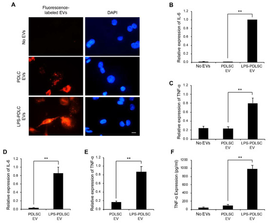 To track the EVs from PDLSCs in the THP-1 cells, the EVs were labeled with a fluorescent dye using ExoGlow-Membrane EV labeling kit (Figure 7A). Both the labeled EVs, from the control PDLSCs and LPS-preconditioned PDLSCs, were detected in the THP-1 cells and we could not find a major difference between them. Since the above result in Figure 3 showed that the conditioned media from LPS-preconditioned PDLSCs strongly enhances the M1 polarization of THP-1 cells, we investigated whether the EVs have a similar effect on macrophages, under the same experimental conditions. After 24 h of EV treatments of THP-1 cells along with IFN-γ, the mRNA expression for IL-6 and TNF-α was analyzed to investigate the M1 polarization of macrophages. The M1 polarization was increased in THP-1 cells treated with EVs from the LPS-preconditioned PDLSCs compared to the control PDLSCs (Figure 7B,C). To exclude the possibility of effects caused by the contaminated LPS, the LPS were removed from the culture supernatant during the EV isolation process, using the endotoxin removal kit. EVs subjected to the endotoxin removal process also showed the M1 polarization effect in THP-1 cells, similar to that of the LPS-preconditioned EVs (Figure 7D,E), indicating that the M1 polarization was not mediated by the residual LPS, but by the EVs. The production of TNF-α was analyzed in EV-treated THP-1 cells by ELISA (Figure 7F). The expression of the TNF-α protein was highly upregulated in the THP-1 cells treated with EVs from the LPS-preconditioned PDLSCs, which is consistent with their mRNA expression.