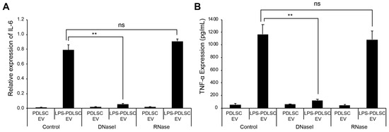 Treatment of EVs with DNase I abolished M1 polarizing effect in THP-1 cells. EVs from PDLSCs or LPS-preconditioned PDLSCs were treated with DNase I or RNase. Each EV sample was applied to THP-1 cells and the M1 polarization was analyzed by RT-qPCR and ELISA. (A) mRNA expression of IL-6 in THP-1 cells treated with each indicated EV sample. (B) TNF-α expression in the culture supernatant from THP-1 cells treated with each indicated EV sample. Data shown as the mean ± SD, n = 3, ns: Not significant, ** p < 0.01.