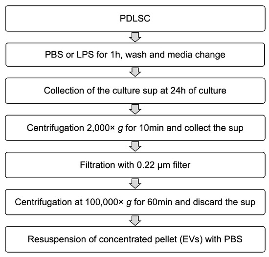 Periodontal ligament stem cells (PDLSCs) and THP-1 were obtained from Cell Engineering for Origin (Seoul, Korea, http://www.cefobio.com/index.php?hCode=products_02_01_04) and American Type Culture Collection (Manassa, VA, USA), respectively. PDLSC was cultured in α-Minimum Essential Medium (MEM, Gibco, Grand Island, NY, USA) with 10% fetal bovine serum (FBS, Hyclone, Logan, UT, USA) and 1% antibiotics (Lonza, Allendale, NJ, USA). THP-1 cells were cultured in RPMI-1640 medium (Welgene, Seoul, Korea) supplemented with 10% FBS, 0.05 mM of 2-mercaptoethanol, and 1% antibiotics. The cells were maintained in a humidified atmosphere of 5% CO2 at 37 °C. LPS from E. coli O111:B4 was purchased from Sigma-Aldrich (Gillingham, UK). Recombinant human IL-4 and IFN-γ was obtained from Cusabio technology (Houston, TX, USA). Recombinant human IL-13 was purchased from PEPRO tech (Rocky Hill, NJ, USA). FBS in all experiments was depleted EVs by ultracentrifugation at 100,000 g for 16 h.