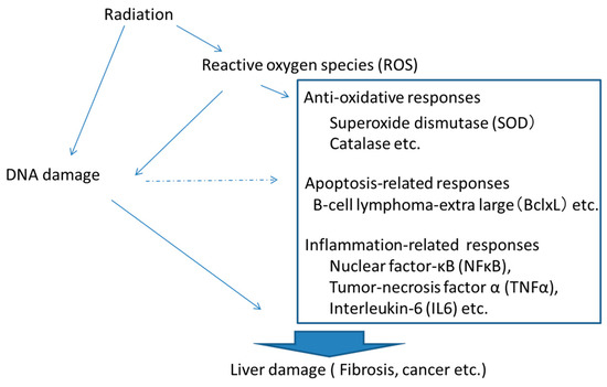 As other epigenetic alterations, changes in microRNA (miRNA) expression are interesting and represent a prominent molecular target for medical treatment [31,32]. In the liver, miRNA21 appears related to radiation-induced liver carcinogenesis [33]. In particular, iron ion beam, high-linear energy transfer (LET) particle radiation appears to markedly induce miRNA21 expression. In addition, miRNA34 is reportedly also altered after irradiation [34].