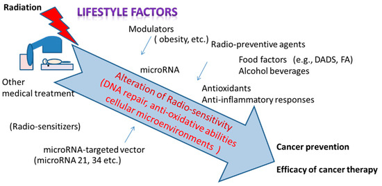 Drinking alcohol is considered to be related to many diseases, including cancers and excess drinking is a prominent social issues. Indeed, a relationship between alcohol and tumor development has been reported [63]. The carcinogenesis in the liver has been considered to be related to alcohol drinking. Alcohol intake seems to influence radiation effects [14]. Alcohol-related cancers appear to have a higher incidence among nuclear workers. The adverse effects of alcohol beverages are considered to be mostly induced by ethanol. Ethanol has been also observed to influence radiation damage in HepG2 cells [64]. Alcohol is metabolized in the liver and induces oxidative stress [65]. Excess alcohol drinking is known to induce adverse effects on health and can lead to cancer development and liver diseases [66,67]. Excess alcohol intake induces miRNA34 expression [68]. During alcoholic liver diseases, miRNA34 is likely to be a critical mediator in ethanol-activated survival signaling. This miRNA is also an important player in the management of radiotherapy, because it seems to be related to radio-resistance in tumors and radiotoxicity, such as fibrosis in normal tissues [31] (Table 2).