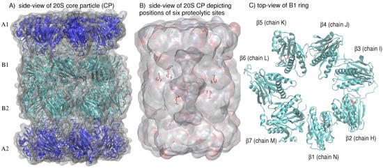 The 20S proteasome CP was modeled using the PDB 5CZ4 structure (2.30 Å resolution) [5]. The structure consists of 28 subunits; (1-7), (1-7), (1-7), and (1-7). Here, the two outer rings will be given the notation and ; the inner two rings will be denoted as and . The subunits of the outer rings will accordingly be denoted with lowercase while the subunits of the inner rings, and , are denoted with . The 28 subunits have corresponding chain labels, as assigned in the PDB [5], A–Z and a and b; these help further distinguish them, and they are listed in Table A1 for clarity [5].