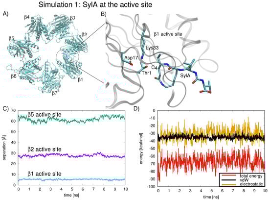 In the first simulation (simulation 1, Figure 2A), at t = 0 ns, the inhibitor is localized in the region of the active site (see Figure 2B for scheme of SylA located at active site). The inhibitor remains anchored at this position for the duration of the 10 ns simulation (Figure 2C, separation of SylA C from the Thr1-O of , , and shown in blue, green, and purple lines, respectively). The interaction energy between SylA and all seven subunits was calculated for the 10 ns simulation; the average interaction energy is −67.37.5 kcal/mol (Figure 2D, red line). The total interaction energy can be broken down into van der Waal’s interactions (Figure 2D, black line) and electrostatic interactions (Figure 2D, orange line), both of which are favorable throughout the 10 ns sampling period, explaining the stability of the inhibitor’s position at the active site of .