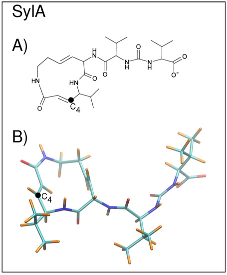 The protein system was treated using the CHARMM36 parameter set for the protein [16,17] and the TIP3P model for water molecules [15]. For the syringolin inhibitor SylA, initial CHARMM parameters for the SylA were generated with the CHARMM General Force Field (CGenFF) (version 1.0.0) [18]. Next, the charges of the heteroatoms atoms (N and O) were optimized in the following manner. At each of the twelve hetero sites (Figure 3), an individual water molecule was constructed such that a colinear hydrogen bond was formed between the water molecule’s oxygen and the heteroatom. The resulting hydrogen bond energy and bond length were calculated [HF/6-31g* with a gradient tolerance of 0.00000001 kcal/mol/Å] with the GAMESS suite in CHARMM [19,20]. The resulting set of charges was then used to recalculate the charges for the entire molecule. The final set of SylA atomic charges, corresponding to atoms as shown in Figure A1, is listed in Table A2. Energy minimization was performed using the ABNR routine in CHARMM [14].