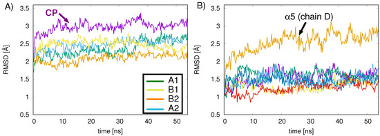 (A) protein The backbone RMSD (Å) relative to the crystal structure is shown over the 54 ns simulation time for the apo 20S CP (purple) and for the four ring systems (green), (yellow), (orange), and (blue) and (B) for the subunits: (chain G) red, (chain A) purple, (chain B) green, (chain C) light blue, (chain D) orange, (chain E) yellow, (chain F) dark blue. Subunit (chain D) (orange), indicated with the arrow, shows the largest RMS deviations over the simulation time period, arising from less structured loops.