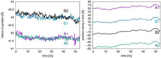 (A) The radius of gyration (Å) and (B) the position along the Z-axis of each ring’s C.O.M. is shown for each of the four ring systems (purple), (blue), (black), and (green) over the 54 ns simulation time.