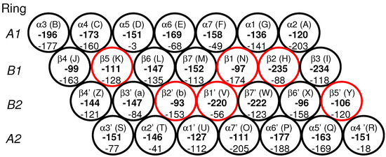 The diagram shows the arrangement of the 28 subunits within the four heptameric rings, , , , and , of the CP of the 20S proteasome. The subunits containing proteolytic active sites are outlined in red. The chain labels, according to PDB 5CZ4 [5], are listed in parentheses for clarity. Electrostatic energies (kcal/mol) (bold numbers) and solvation binding energies (kcal/mol) are shown for each subunit.