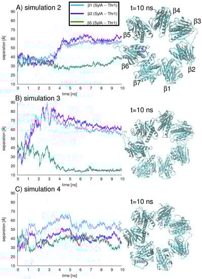 Three independent simulations, labeled simulation 2, 3, and 4 (shown in figures A–C, respectively), were carried out with the +SylA complex over 10 ns. In each simulation, the SylA position with respect to the three binding sites is quantified by the separation of SylA C from the Thr1-O of (blue), (purple), and (green). Snapshots of the SylA inhibitor (dark blue) inside the ring (active sites depicted in red) are shown for each simulation at t = 10 ns.