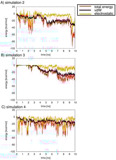 In simulation 4 (Figure 7C), the inhibitor visits regions near , nearly equidistant (ca. 36 Å at t = 10 ns) from and , with some fluctuations in position (Figure 7C, purple and green lines, respectively); at t = 10 ns, SylA is farthest (ca. 48 Å) from (Figure 7C, blue line) and located at the interface between and . This region is characterized by a large gradient in electrostatic energy (see Figure 6) which may attract the inhibitor. To check the forces driving the inhibitor’s dynamical position, the interaction energy between the SylA inhibitor and all seven subunits was calculated for each of the three trajectories (shown in Figure 8A–C).