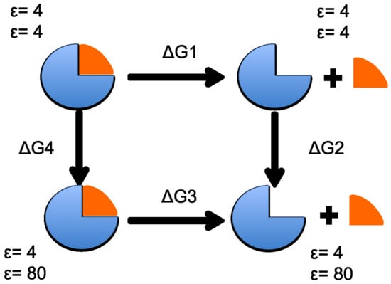 To estimate the solvation binding energy of each ring subunit, the components of the standard thermodynamic energy cycle were calculated for each subunit according to the scheme in Figure 9. The term is the free energy difference, in an environment with a homogeneous dielectric constant (), between the product (ring and with subunit separated) and the reactant (complete ring). and refer to the free energy difference gained from moving the solute from an environment with a homogeneous dielectric constant (, ) to a heterogeneous dielectric environment ( for the solute, for the solvent). The binding energy, , is then calculated from .