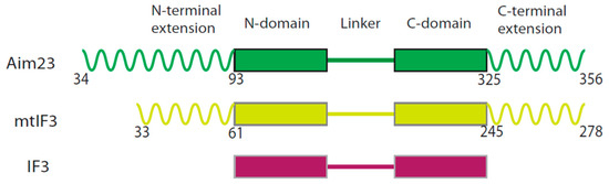 As mentioned above, the overall topology of Aim23p resembles that of mammalian mtIF3. According to the in silico structure prediction [13], Aim23p consists of an N-terminal mitochondrial targeting sequence followed by a 60 amino acid long N-terminal extension, N-domain, linker, C-domain, and a 32 amino acid long C-terminal extension (Figure 1).