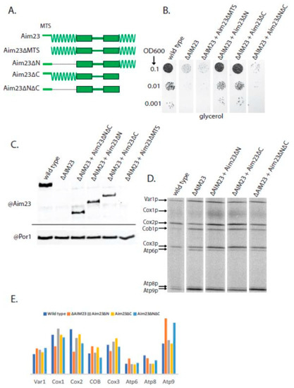In order to assess the influence of the above-described Aim23p mutations on the mitochondrial translation in more detail, we analyzed the profiles of protein biosynthesis products in the mitochondria of mutant yeast strains. For that, we added cycloheximide to the cultured cells, which completely blocked cytosolic translation but did not affect this process in mitochondria. Thereafter, we supplied yeast cultures with radiolabeled 35S-methionine, which could incorporate only in the mitochondrially-synthesized polypeptide chains [20]. The result of the radiolabeled mitochondrial proteins separation is shown in Figure 2D. In our previous work, we performed the analogous experiment with wild-type and ∆AIM23 strains and found that the absence of Aim23p had no meaningful effect on the amount of Var1p and led to a decrease in the amount of Cox1p and Cox3p and, surprisingly, to a significant increase in the amount of Atp6p and Atp9p [15]. This is exactly what we have obtained in this work (Figure 2E). Speaking about mutant strains containing truncated Aim23p versions, we have not revealed a solid correlation between their growth on glycerol and the rate of individual mitochondrial proteins synthesis. The levels of Cox1p, Cox2p and Atp6p were very similar in these strains, all being closer to those of the wild-type. However, the Atp9p synthesis rate was increased in Aim23∆N∆C (like in ∆AIM23 strain) and was not affected in the Aim23∆N and Aim23∆C strains, which perfectly fits the results of the glycerol growth experiment. Thus, the presence of at least one extension ensures the functionality of the mitochondria.