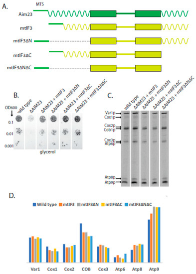As in our previous studies, mtIF3 strain grew with the same rate as wild-type strain. Surprisingly, this was also true for all other mutant strains. Moreover, we were not able to detect any significant difference in individual protein synthesis rates in comparison with the wild type when analyzing 35S-methionine incorporation into mitochondrial translation products in discussed strains (Figure 4C,D), with the exception of cytochrome b which was slightly decreased in all strains, and may be Atp9 which was very slightly increased.This means that mammalian mtIF3 versions without one terminal extension or even without both of them are as functional in yeast mitochondria as wild-type Aim23p. This suggests that mammalian mtIF3 and Aim23p have quite diverged and their terminal extensions have different functions in mitochondriawhich is in a good agreement with our previous data [13].