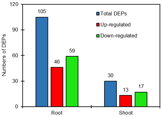 Number of differentially expressed proteins (DEPs) in roots and shoots of salt-treated sugar beet plants compared with untreated plants.