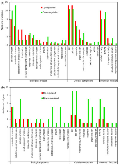 Gene Ontology (GO) analysis of the DEPs in roots (a) and shoots (b) of sugar beet exposed to salt condition. Red and green bars represent up- and down-regulated.