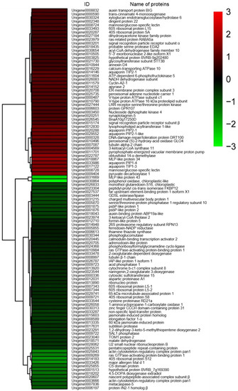 Heat map diagram of expression patterns for differentially expressed proteins in roots of salt-treated sugar beet plants compared with untreated plants. The color scale bar in the right, bottom corner indicates increased (red) and decreased (green) levels in response to salt change.