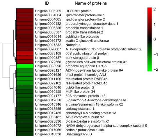 Heat map diagram of expression patterns for differentially expressed proteins in shoots of salt-treated sugar beet plants compared with untreated plants. The color scale bar in the right, bottom corner indicates increased (red) and decreased (green) levels in response to salt change.