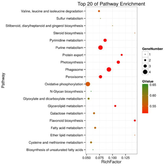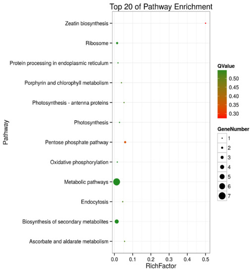 Top 20 pathway enrichments of DEPs in shoots of salt-treated sugar beet plants compared with controlled plants. The Y-axis indicates the KEGG pathway, the X-axis indicates the rich factor. The dot size indicates the number of DEPs of the pathway, and the dot color indicates the Q-value. Rich factor indicates the number of differentially abundant proteins participating in a KEGG pathway as a proportion of proteins involved in the pathway in all identified proteins. A P-value less than 0.05 was defined as statistically significant.