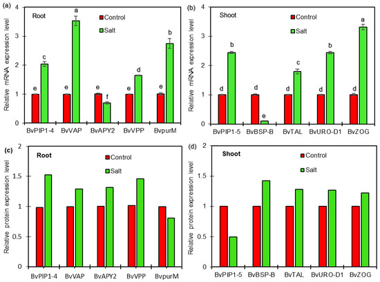 To determine whether the DEPs are associated with transcriptional changes, qRT-PCR analysis was performed to detect the correlation between proteins and genes expression in roots and shoots of sugar beet seedlings exposed to salt treatment in the present study. The results showed that four genes, BvPIP1-4 (Unigene0033986), BvVP (Unigene0011701), BvpurM (Unigene0024368), and BvVAP (Unigene0010790), were up-regulated, and one gene, BvAPY2 (Unigene0014152), was down-regulated at transcriptional levels in roots (Figure 7a). It was observed that four genes, BvPIP1-5 (Unigene0033990), BvTAL (Unigene0005386), BvURO-D1 (Unigene0000482), and BvZOG (Unigene0016372), were up-regulated at transcriptional levels in shoots (Figure 7b). Further analysis indicated that six of the selected proteins, including BvPIP1-4, BvVP, and BvVAP in roots and BvTAL, BvURO-D1, and BvZOG in shoots, showed increased abundance, consistent with the changes in abundances of the corresponding proteins as revealed from the iTRAQ-based experiment (Tables S1 and S2, Figure 7c,d), indicating a good correlation between the expression levels of protein and mRNA and a high quality of the quantification results in the present study. Interesting, at the transcriptional level, BvAPY2 and BvBSP-B were found to be down-regulated, and BvpurM and BvPIP1-5 were up-regulated in salt-treated plants compared with control plants (Figure 7a,b). However, enhanced abundance of BvAPY2 and BvBSP-B and reduced abundance of BvpurM and BvPIP1-5 were detected in salt-responsive proteome in the present study. These results indicated that their protein levels might be determined not only at the transcriptional level but also at the post-translational level.
