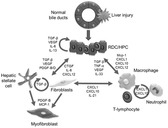 In cholangiopathies, to restore the normal liver architecture, cell types involved in the reparative/regenerative hepatic response, i.e., BECs (RDCs, and HPCs), cells of mesenchymal origin (PFs, and HSCs), and inflammatory infiltrate (macrophages and neutrophils) interact each other exchanging numerous peptides and sharing several ligands and receptors [17,59] (Figure 1). If this finely tuned response is incorrect, this could lead to the establishment of a chronic cholangiopathy, accompanied by the deposition of fibrosis, eventually leading to cirrhosis, and by a massive hepatic inflammation. The interactions among these cell milieus are mediated by three different categories of peptides that could be grouped as growth factors, proinflammatory and profibrotic cyto/chemokines, and morphogens.
