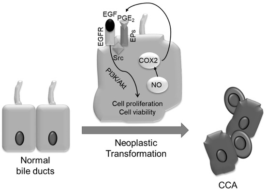 Figure 2. Chronic inflammation is responsible for the neoplastic transformation of the biliary epithelial cells. Alterations are due to the presence in the hepatic microenvironment of several molecules, such as peroxinitrites and oxygen free radicals that could induce the accumulation of DNA damage. Nitric oxide (NO) is able to stimulate cell proliferation and escape from apoptosis through the activation of COX2 that stimulates the p38 MAPK/JNK axis to secrete PGE2, that further transactivates the epidermal growth factor receptor (EGFR); this latter receptor also activates the PI3K/AKT pathway responsible for the proliferation and resistance to apoptosis in cholangiocarcinoma (CCA).