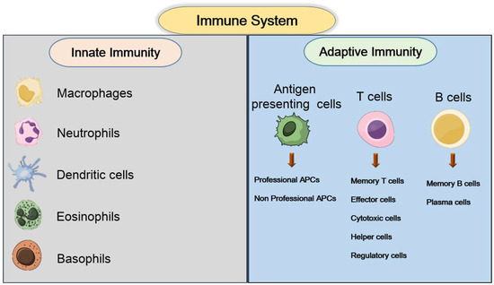 Immune checkpoint blockade as a therapeutic modality that has gained more attention after the modification of CAR T cell-modified T cells to block specific immune regulatory checkpoints. The advancement in checkpoint blockade therapy resulted in the invention of the PD-1 (programmed cell death-1) and PDL-1 (programmed cell death ligand-1) blockade method, which is characterized by both the specificity and the improved outcome. Another intracellular protein present in T cells, cytotoxic T lymphocyte-associated protein-4, can also be utilized to inhibit the regulation of T cells followed by the arrest of both the proliferation and activation of the tumor cells [41,42,43,44,45,46]. The major cells and components involved in the innate and adaptive immune responses are given below (Figure 1) [47].