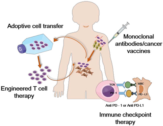 Both the innate and adaptive immune responses are different and complex in nature. The innate immune system mainly acts through the phagocytosis pathway, which is composed of phagocytic cells such as natural killer (NK) cells, macrophages, neutrophils, and monocytes. The main mode of action of the innate immune response is to discriminate the proteins presented by these cells from those of invading cells. The factors that are able to discriminate these presented proteins from those of the tumor cells are called major histocompatibility complex class I (MHC-I) [30,31,32,33,34]. The adaptive immune responses represent specific and effective methods to inhibit tumor growth. Tumor-associated antigens (TAAs) are the main prompting factor for immune reactions. TAAs can be recognized by both T cells and B cells; thus, targeting TAAs would be a better way to inhibit tumorigenesis. Targeting of TAAs can be done in many ways, among which targeting using antigens is more common and effective. Another method to inhibit tumor growth is to target the immune checkpoint with different specific antibodies [35,36,37,38,39,40].