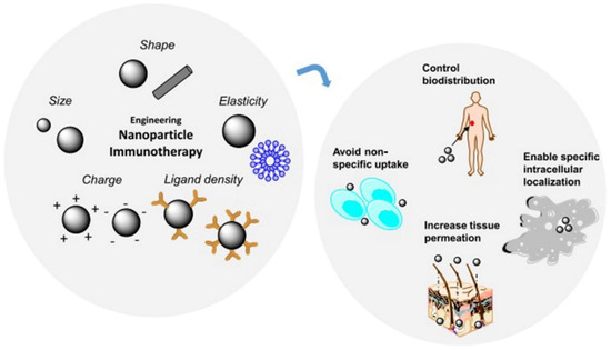 Bioactive nanoparticles are considered to be the prime option for immunotherapy due to their special characterizations, such as size, shape, charge, elasticity, and ability to work as a carrier [54,55]. Nanoparticle engineering could be useful for the modification of nanoparticles, particularly for targeting, carrying antigens/adjuvants or drugs for immunotherapy. The size of the nanoparticle can affect the pharmacokinetics, transport, and cellular uptake of the nanoparticle, which can critically affect the therapeutic efficacy [56]. The shape of the nanoparticle also greatly affects the circulation and accumulation of the nanoparticle in the desired site [57].