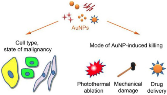 Gold nanoparticles for immunotherapy are considered to be a highly promising area of research due to their favorable characteristics. Recently, a number of studies have indicated that the ability of gold nanoparticles makes them a perfect carrier for immunotherapy [84]. These nanoparticle systems are broadly used as carriers for antigenic proteins and gene/oligonucleotide delivery to specific sites of interest. At the same time, research on combination therapy with PTT has also been in progress [85,86,87,88]. Different kinds of gold nanoparticles have been synthesized and studied as therapeutic carriers for cancer treatment. The type of gold nanoparticles, including their size, charge, shape, and functional group, has also contributed to the efficacy in accumulating different immune cells (Figure 5) [89].