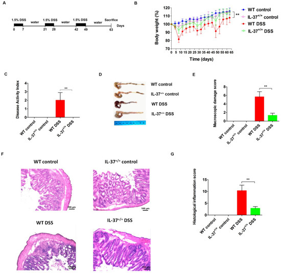 Chronic colitis was induced by three cycles of 1.5% dextran sodium sulfate (DSS), and each cycle of DSS was defined as one week of DSS administration followed by a recovery period of two weeks with normal drinking water. Control mice (WT and IL37+/+) received normal drinking water throughout the duration of the experiment. All mice were sacrificed at day 63 (Figure 1A). The body weight of mice was monitored every 3–4 days after the initiation of DSS. The experiments were repeated at least three times.
