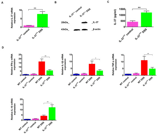 The gene and protein expression of IL-37 and the expression of colonic IFN-γ, IL-1β, TNF-α, and IL-10 following DSS induction in IL-37+/+ mice. (A,B) Expressions of IL-37 mRNAs and protein levels within colonic tissues following DSS induction in IL-37+/+ mice, respectively. (C) Expressions of IL-37 proteins in serum following DSS induction in IL-37+/+ mice. (D) Expressions of IFN-γ, IL-1β, TNF-α, and IL-10 mRNAs within colonic tissues following DSS induction in IL-37+/+ mice. Data are means ± SEM (n = 6). * p < 0.05, ** p < 0.01.