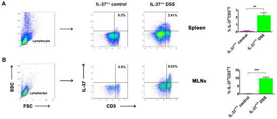 The IL-37-producing T-cells in the spleen and mesenteric lymph nodes (MLNs) in IL-37+/+ mice. Representative dot plots showing the percentage of IL-37+ cells within the CD3+ T-cell population in the (A) spleen and (B) MLNs of DSS-treated mice at day 63, respectively. Data are means ± SEM (n = 6). ** p < 0.01, *** p < 0.001.