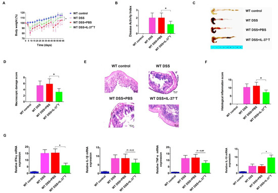 IL-37+ T-cells play a protective role in DSS-induced chronic colitis in mice. (A) Relative weight curves of WT mice, DSS-induced WT mice, DSS-induced WT mice treated with PBS, and DSS-induced WT mice injected with IL-37+ T-cells in chronic colitis. The statistical significance between the relative weights of DSS-induced mice injected with IL-37+ T-cells versus DSS-induced mice treated with PBS at the end of the experiment is shown. (B) The disease activity index (DAI) was determined at day 63 of the study period, based on body weight loss (0, none; 1, 1–5%; 2, 5–10%; 3, 10–20%; 4, >20%), stool consistency (0, normal; 2, loose stool; 4, diarrhea), and stool blood (0, negative; 2, fecal occult blood test positive; 4, gross bleeding). (C) Representative pictures of the colon from indicated treatment cohorts. (D) Macroscopic damage score of the colon in the four groups. (E) Representative haematoxylin and eosin (H&E) staining of colon sections of mice. (F) Histological inflammation score. This score comprises the sum of architecture of the bowel, infiltration of neutrophils and mononuclear cells, gobleT-cell depletion, and epithelial cell erosion. Three sections per animal were evaluated. (G) Expressions of IFN-γ, IL-1β, TNF-α, and IL-10 mRNAs within colonic tissues in the four groups. Total RNA with the RNAiso Plusi Kit. cDNAs were synthesized by using the RevertAid First Strand cDNA Synthesis Kit according to the manufacturer’s instructions. qPCR amplification reactions were prepared with the SYBR Green PCR Kit and performed using the CFX96 Real-Time System. Data are means ± SEM (n = 6). * p < 0.05.