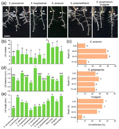 LR development in wild tomato species and commercial tomato cultivars after root tip excision. (a) Representative images of the entire root system of selected genotypes at 3 days after root tip excision. The arrowhead points to the root-hypocotyl junction, and the asterisk indicates the tip of the PR. Scale bar: 10 mm. (b) Number of LRs. Average ± SD values are shown. (c) Average percentages of LR distribution along the length (i.e., depth) of the PR. (d) Distance between consecutive LRs and (e) LR length; median values are shown. Different letters indicate significant differences (LSD; p-value < 0.01) over genotypes (b,d,e) or regarding PR depth domains (c).