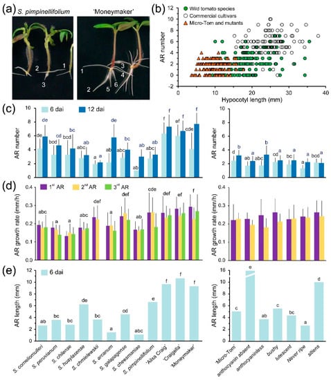 ARs are postembryonic roots that are formed from non-root tissues, such as leaves and stems, naturally or in response to altered environments [52,53]; these structures may also be induced by mechanical damage or during vegetative propagation of stem cuttings [54,55]. To test the ability of the different tomato genotypes to produce ARs after wounding, we excised the whole root system 6 days after sowing (das; Figure S1), which induced AR formation at the hypocotyl base above the wounding site shortly afterwards (Figure 4a and Figure S7). We followed AR initiation by scoring the presence of newly emerged AR primordia at the hypocotyl (see Materials and Methods). We found a significant delay in AR initiation in S. cheesmaniae and S. chilense compared to that in other studied wild tomato species and commercial cultivars; the emergence rate of consecutive ARs also varied, although not significantly, among most of the studied genotypes (Figure S8). We found striking differences in the number of ARs produced by the studied genotypes at 6 and 10 days after induction (dai), irrespective of their hypocotyl length (Figure 4b). Interestingly, the four studied commercial cultivars produced more ARs (7.0 ± 1.6 ARs at 10 dai; n = 102) than the other wild tomato species (Figure 4c), including the direct ancestor of cultivated tomato, S. pimpinellifolium (3.3 ± 1.2 ARs at 10 dai; n = 21), suggesting that enhanced AR formation could have been positively selected during domestication or, alternatively, that this trait was genetically linked to the other yield-associated traits selected during S. lycopersicum domestication [56]. AR growth rates were significantly higher in commercial cultivars, S. chmielewskii, S. galapagense and S. pimpinellifolium, than in the other studied genotypes (Figure 4d). In contrast, we found no differences in the growth rates of the first, second and third ARs during the first 12 h for the studied genotypes (Figure 4d), suggesting that ARs grow autonomously from the hypocotyl after emergence or that the hypocotyl-derived signal fueling AR growth was not limiting. Differences in AR length were observed between the wild tomato species and commercial cultivars studied at 6 dai (Figure 4e), but these differences were normalized at later stages (Figure S8), indicating a genotype-dependent dynamic regulation of the AR growth rate. Concerning the growth angle of ARs, S. arcanum and ‘Moneymaker’ also presented extreme values, with 110.8 ± 8.2° (n = 29) and 131.4 ± 24.1° (n = 33), respectively (Figure S8), which were very similar to the growth angles found for their LRs (see above).