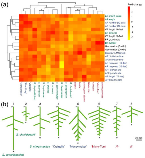 The root system is essential for plant growth because of its basic functions in the selective absorption of water and nutrients, as a mechanical support and storage organ, as a selective barrier against pathogens, and in the modulation of some stress responses [1,2]. However, our knowledge about the genetic mechanisms that modulate root system architecture (RSA) in species of agronomic interest is, with some exceptions, very limited [3,4,5]. Cultivated tomato (Solanum lycopersicum L.) is an important vegetable grown worldwide [6]. Tomato crops are particularly sensitive to drought, have poor nitrogen and phosphorus use efficiency and consequently require intensive irrigation and fertilization to maintain high yield and fruit quality [7,8]. Manipulation of RSA traits may improve water and nutrient capture under normal and extreme climate conditions [9,10]. The cultivated tomato is phylogenetically related to another 13 species of wild tomatoes, all of which are native to South America and show considerable morphological and ecological diversity [11]. Compared with the large genetic variability found in wild tomato species, the genetic diversity of the thousands of cultivated tomato varieties is very limited due to their recent domestication from a small number of individuals [12,13].