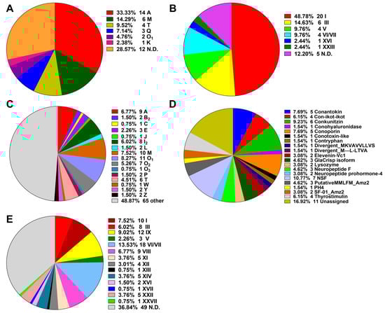 Summary of the superfamilies and cysteine patterns of conotoxins in C. quercinus. (A) The superfamilies reported previously. (B) The cysteine patterns reported previously. (C) Total superfamilies identified in this study. (D) Subdivision of the conotoxins summarized from the ‘Other’ group in (C) into further categories. (E) The cysteine patterns identified in this study.