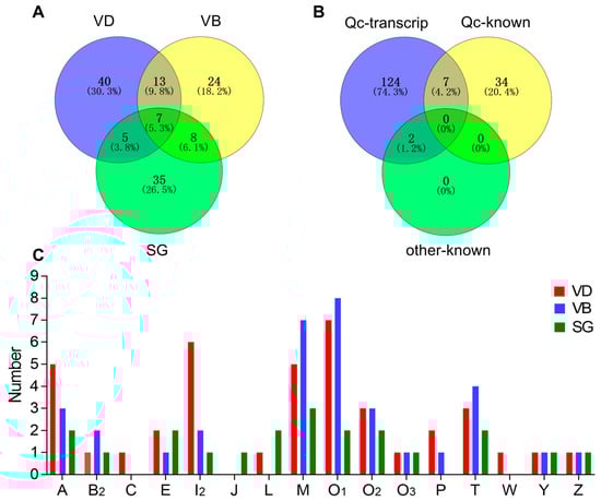 Comparison of conotoxin transcripts from various C. quercinus datasets. (A) Relationship of the identified conotoxins from the VD, VB and SG datasets. (B) Comparison among the total identified conotoxins from C. quercinus (Qc-transcript), the conotoxins reported previously in C. quercinus (Qc-known), and those from other cone snails (other-known). (C) Subdivision of 16 conotoxin superfamilies from our VD, VB and SG datasets.