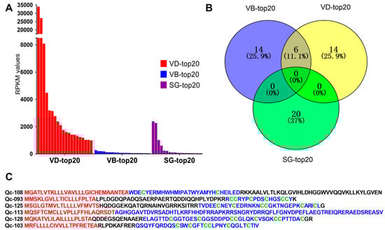 The top 20 conotoxins with the highest values of fragments per kilobase of exon per million fragments mapped (FPKM) from the three transcriptome datasets. (A) Comparison of the FPKM values for individual conotoxins within each dataset. (B) A Venn diagram of the top 20 conotoxins from each of the VD, VB and SG datasets. (C) Comparison of six conotoxins sequences found in the VD-top20 and VB-top20. The signal regions predicted by the ConoPrec tool are marked in red, and the mature regions (in blue) and cysteine residues (in green) are presented for comparison.