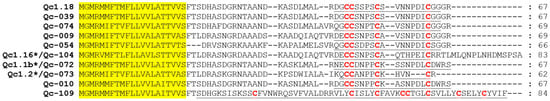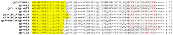 Alignment of the achieved M-superfamily sequences from our C. quercinus transcriptomes. * represents the conotoxins that have been reported previously. The signal regions are highlighted in yellow, the mature regions are underlined, and cysteine residues (in red) are marked for comparison.