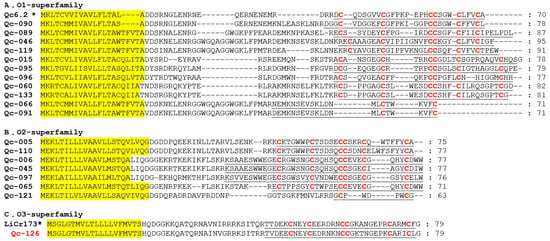 Alignment of the achieved O-superfamily sequences from our C. quercinus transcriptomes. (A) The sequences of O1-superfamily. (B) The sequences of O2-superfamily. (C) The sequences of O3-superfamily. * represents the conotoxins that have been reported previously. The signal regions are highlighted in yellow, the mature regions are underlined, and cysteine residues (in red) are marked for comparison.