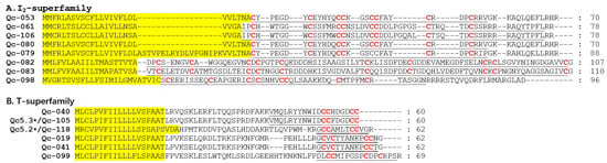 I2-superfamily peptides have three cysteine frameworks in the primary sequences (XI, XII, and XIV), with the characteristic pattern of C-C-CC-CC-C-C. They are longer than those belonging to other Conus peptide families []. Eight I2-superfamily conotoxins were identified in the present study (Figure 7A), in which five presented with the framework XI, one owned the framework XII, and two possessed the framework VIII. Interestingly, framework VIII is often present in the B- and S-superfamilies, but Qc-082 and Qc-083 with the framework VIII were not similar to those conotoxins of the B- and S-superfamilies [,]. In fact, Qc-082 and Qc-083 are the first I2-superfamily conotoxins with the type VIII cysteine framework C-C-C-C-C-C-C-C-C-C. Meanwhile, six T-superfamily conotoxins were also identified (Figure 7B), in which three presented with the framework V (CC-CC), one owned the framework I (CC-C-C), and two possessed the framework XVI. For example, Qc-105 and Qc-118 showed 100% identity with Qc5.3 and Qc5.2 from C. quercinus, respectively.