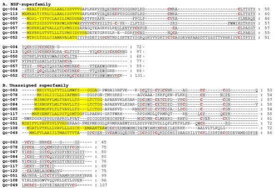 Alignment of the achieved new superfamily (NSF) and unassigned superfamily sequences from our C. quercinus transcriptomes. (A) The sequences of NSF-superfamily. (B) The sequences of unassigned superfamily. The signal regions are highlighted in yellow, the mature regions are underlined, and cysteine residues (in red) are marked for comparison.
