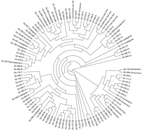 To investigate the relationships among these identified conotoxins from C. quercinus, we constructed a phylogenetic tree of all conotoxin superfamilies based on the aa sequences of the signal regions (Figure 9). This analysis showed that most of the conotoxins from C. quercinus transcriptomes were successfully allocated to the known superfamilies, such as B-, E, M-, O2- and T-superfamilies. For example, the I2-superfamily conotoxins are divided into three groups, including group I (Qc-082 and Qc-083), group II (Qc-098, Qc-079, Qc-053, Qc-080), and group III (Qc-106, Qc-061).