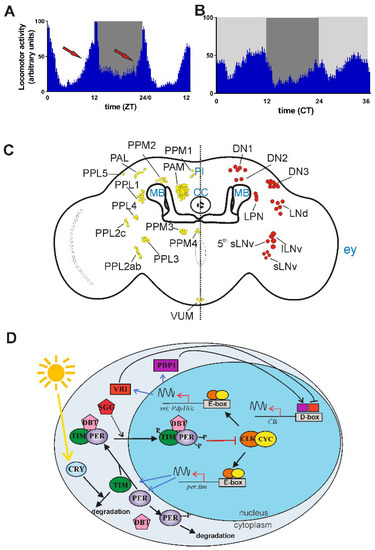 - Peschel, N.; Helfrich-Förster, C. Setting the clock--by nature: Circadian rhythm in the fruitfly Drosophila melanogaster. FEBS Lett. 2011, 585, 1435–1442. [Google Scholar] [CrossRef] [PubMed]