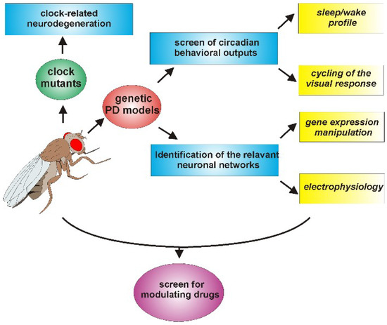 Although the number of studies concerning the relationship between PD and the circadian clock performed so far using Drosophila is still limited, the results obtained are, in our opinion, promising, particularly in view of considering this organism as an additional model to explore these aspects (Figure 3).